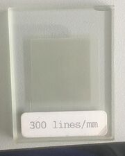 The image on the right shows a laser beam diffracted by a grating into n = 0, and ±1 beams. The angles of the first order beams are about 20°; if we assume the wavelength of the laser beam is 600 nm, we can infer that the grating spacing is about 1.8 μm.