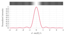 The interference fringe maxima occur at angles [math]\displaystyle{ d \theta_n = n \lambda,\quad n = 0, \pm 1, \pm 2, \ldots }[/math] where λ is the wavelength of the light. The angular spacing of the fringes is given by [math]\displaystyle{ \theta_\text{f} \approx \lambda/d. }[/math]