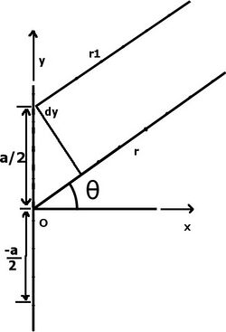 where [math]\displaystyle{ \beta=\omega/c=2\pi /\lambda }[/math]. However [math]\displaystyle{ r_1=r-y\sin\theta }[/math] and integrating from [math]\displaystyle{ -a/2 }[/math] to [math]\displaystyle{ a/2 }[/math],