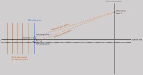 If [math]\displaystyle{ k\frac{b^2}{2{r_1}} \cos^2 \theta = \pi \frac{b^2}{\lambda r_1} \cos^2 \theta \ll \pi }[/math] so [math]\displaystyle{ \frac{b^2}{\lambda r_1} \cos^2 \theta \ll 1 }[/math], then the phase difference is [math]\displaystyle{ k r_2 - k r_1 \approx -kb\sin \theta }[/math]. The geometrical implication from this expression is that the paths r2 and r1 are approximately parallel with each other. Since there can be a diffraction plane - observation plane diffracted wave path which angle with respect to a straight line parallel to the optical axis is close to 0, this approximation condition can be further simplified as [math]\displaystyle{ \frac{b^2}{\lambda }\ll L }[/math] where L is the distance between two planes along the optical axis. Due to the fact that an incident wave on a diffracting plane is effectively a plane wave if [math]\displaystyle{ \frac{b^2}{\lambda }\ll L }[/math] where L is the distance between the diffracting plane and the point wave source is satisfied, Fraunhofer condition is [math]\displaystyle{ \frac{b^2}{\lambda }\ll L }[/math] where L is the smaller of the two distances, one is between the diffracting plane and the plane of observation and the other is between the diffracting plane and the point wave source.