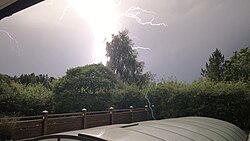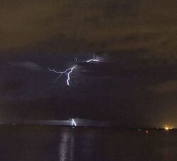 The place on Earth where lightning occurs most often is over Lake Maracaibo, wherein the Catatumbo lightning phenomenon produces 250 bolts of lightning a day.[40] This activity occurs on average, 297 days a year.[41] The second most lightning density is near the village of Kifuka in the mountains of the eastern Democratic Republic of the Congo,[42] where the elevation is around 975 m (3,200 ft). On average, this region receives 158 lightning strikes per square kilometre per year (410/sq mi/yr).[43] Other lightning hotspots include Singapore[44] and Lightning Alley in Central Florida.[45][46]