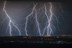 The three main kinds of lightning are distinguished by where they occur: either inside a single thundercloud (intra-cloud), between two clouds (cloud-to-cloud), or between a cloud and the ground (cloud-to-ground), in which case it is referred to as a lightning strike.[4][5] Many other observational variants are recognized, including "heat lightning", which can be seen from a great distance but not heard; dry lightning, which can cause forest fires; and ball lightning, which is rarely observed scientifically.