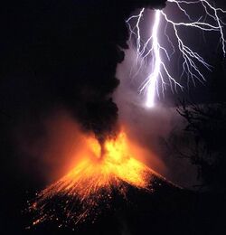 Volcanic activity produces lightning-friendly conditions in multiple ways. The enormous quantity of pulverized material and gases explosively ejected into the atmosphere creates a dense plume of particles. The ash density and constant motion within the volcanic plume produces charge by frictional interactions (triboelectrification), resulting in very powerful and very frequent flashes as the cloud attempts to neutralize itself. Due to the extensive solid material (ash) content, unlike the water rich charge generating zones of a normal thundercloud, it is often called a dirty thunderstorm.