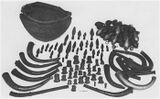Pierced beads and pendants are found, and two necklaces of shells (from Phoenix Park in Dublin) are very carefully made, with graded periwinkle shells; these were on the remains of two males. As an example of the exceptional preservation sometimes possible in items found in anaerobic bogs, part of a finely woven bag with circular handles has survived; it used reedy plant material wound round thin strips of wood. Decorated pottery, apparently made for funerary rather than domestic use, appears to imitate basketry patterns.[33]