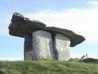 Construction of wedge tombs tailed off from about 2,200 BC,[45] and while the previous tradition of large scale monument building was much reduced, existing earlier megalithic monuments continued in use in the form of secondary insertions of funerary and ritual artefacts. Towards the end of the Bronze Age the single-grave cist made its appearance. This consisted of a small rectangular stone chest, covered with a stone slab and buried a short distance below the surface. The body might be cremated, or not. Decorated pots often accompanied the remains,[46] and later cremated remains were placed inside the urn, which was turned upside-down, and might also have grave goods of various sorts.[45] Numerous stone circles were also erected at this time, chiefly in Ulster and Munster.