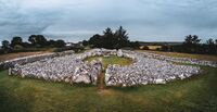 There are several ringforts in the complex topping the Hill of Tara, which seems to have its origins in the late Iron Age, although the site also includes a Neolithic passage grave and other earlier tombs.[61] This is one of a number of major sites connected in later literature and mythology with kingship, and probably had a ritual and religious significance, though it is now impossible to be clear as to what this was. Navan Fort (Emain Macha), another major hilltop site, had a very large circular building constructed on it about 100 BC. It was forty metres across, with 275 tree-posts in rings. The largest was the central post, a tree felled about 95 BC. Within the century following the whole building was destroyed, apparently in a ritual fashion.[63]