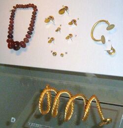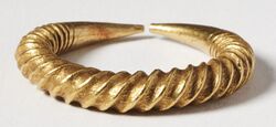 In the early stages of the Bronze Age the gold ornaments included simple but finely decorated gold lunulae, a distinctively Irish type of object later made in Britain and continental Europe, and disks of thin gold sheet. Many of these seem to have been long in use before they were deposited. Later the thin twisted torc made its appearance; this was a collar consisting of a bar or ribbon of metal, twisted into a spiral. Other types of gold jewellery made in Ireland during the Bronze Age, most shared with Britain, include earrings,[40] sun disks,[41] bracelets, clothes fasteners, and in the Late Bronze Age, the distinctively Irish large "gorgets",[42] and bullae amulets.[43] After the Bronze Age goldwork almost ceased to be produced in Ireland;[44] the Irish deposits may well have been essentially exhausted.