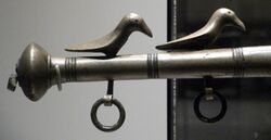 The large Dowris Hoard, originally of over 200 items, mostly in bronze, has given its name to the Dowris Phase or period, as a term for the final phase of the Irish Bronze Age, about 900-600 BC. With 48 examples, the hoard contained all but two of the known examples of the distinctive "crotals", bronze rattles in the shape of a bull's testicle, as well as 26 horns or trumpets, weapons, and vessels.[47] The rather earlier Dunaverney flesh-hook (perhaps 1050–900 BC) is suggestive of a culture where elite feasting was important, and reflects influence from continental Europe; very large riveted bronze cauldrons were also made.[48] Large numbers of bronze weapons were produced, and typical sword shapes changed from shorter ones for stabbing and thrusting on foot, to longer ones, perhaps for a mounted warrior to slash with.[49] This is one example of a Dowris Phase design type originating in the Hallstatt culture of continental Europe, probably transmitted via southern Britain; chapes for scabbards is another.[50]