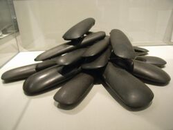 There was a much rarer class of imported prestige axe head made from jadeite from north Italy; these may have been slowly traded across Europe to reach Ireland over a period reaching into centuries, and show no signs of use.[31] Miniature axes, too small to be useful, were made, and a "tiny porcellanite axe" has been found in a passage tomb; another example has a hole for a cord, and may have been worn as jewellery or an amulet. Other stone shapes made were chisels, adzes, maces and spearheads. Only one decorated macehead has been found, in one of the tombs at Knowth, but it is extremely fine. Some finds may also be miniature maceheads.[32]