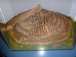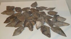The hunter-gatherers of the Mesolithic era lived on a varied diet of seafood, birds, wild boar and hazelnuts.[23][24] There is no evidence for deer in the Irish Mesolithic and it is likely that the first red deer were introduced in the early stages of the Neolithic.[25] The human population hunted with spears, arrows and harpoons tipped with small stone blades called microliths, while supplementing their diet with gathered nuts, fruit and berries. They lived in seasonal shelters, which they constructed by stretching animal skins or thatch over wooden frames. They had outdoor hearths for cooking their food. During the Mesolithic the population of Ireland was probably never more than a few thousand. Surviving artefacts include small microlith blades and points, and later larger stone tools and weapons, in particular the versatile Bann flake.[26]