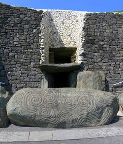 Open-air rock art is another monument type that dates to the Late Neolithic or Early Bronze Age.[34] These carvings are found on open-air boulders and outcrops and the most common motifs are cup and ring marks and radial grooves. This art is often referred to as Atlantic rock art due its similarity to other carvings across Atlantic Europe. In Ireland, the art appears in clusters with the most significant concentrations in County Fermanagh and County Donegal, County Wicklow and County Carlow, County Louth and County Monaghan, Cork, and Kerry. The densest clusters are on the Iveragh and Dingle peninsulas in Kerry.