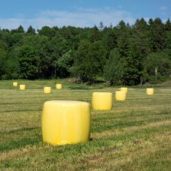 Part of the proceeds from the sale of yellow silage wrappings goes to childhood cancer research, Brastad, Sweden