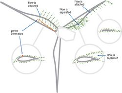 A vortex generator (VG) is an aerodynamic device, consisting of a small vane usually attached to a lifting surface (or airfoil, such as an aircraft wing)[1] or a rotor blade of a wind turbine.[2] VGs may also be attached to some part of an aerodynamic vehicle such as an aircraft fuselage or a car. When the airfoil or the body is in motion relative to the air, the VG creates a vortex,[1][3] which, by removing some part of the slow-moving boundary layer in contact with the airfoil surface, delays local flow separation and aerodynamic stalling, thereby improving the effectiveness of wings and control surfaces, such as flaps, elevators, ailerons, and rudders.[3]