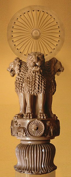 The 24 spoke Ashoka dharmachakra is present in the modern flag of India, representing the pan-Indian concept of Dharma.[24] The modern State Emblem of India is a depiction of the Lion Capital of Ashoka (Sanchi), which includes the dharmachakra. An integral part of the emblem is the motto inscribed in Devanagari script: Satyameva Jayate (English: Truth Alone Triumphs).[25] This is a quote from the Mundaka Upanishad,[26] the concluding part of the Vedas.