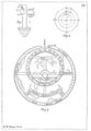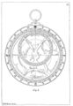 The whole of this section describes the form of an astrolabe. The astrolabe is based on a large plate ("The moder" or "mother") which is arranged to hang vertically from a thumb ring. It has "a large hool, that resceiveth in hir wombe the thin plates".[19][lower-alpha 9] The back of the astrolabe is engraved with various scales (see Skeat's sketch below). Mounted on the back is a sighting rule (Skeat's fig 3, below) "a brod rule, that hath on either end a square plate perced with certein holes".[20][lower-alpha 10] To hold it all together there is a "pyn" with a "littel wegge" (wedge) as shown below at Skeat's fig 7.[21] Into the "womb" various thin plates can be inserted which are designed for a particular place: "compowned after the latitude of Oxenforde".[22][lower-alpha 11] These plates show the star map. Surmounting them is a "riet" or "rete" which is a pierced framework carrying the major stars shown at fig 9. Outside all is another rule, this time not with sighting holes, mounted on the common pivot, see fig 6.