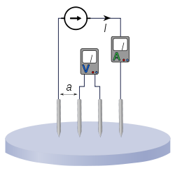 In most systems, metal probes (electrodes) are inserted into the ground to obtain a reading of the local electrical resistance. A variety of probe configurations are used, most having four probes, often mounted on a rigid frame. In these systems, two of the probes, called current probes, are used to introduce a current (either direct or low-frequency switching current) into the earth. The other two probes, called voltage or potential probes, are used to measure the voltage, which indicates the local resistivity. In general, greater probe spacings yield greater depth of investigation, but at the cost of sensitivity and spatial resolution.[2]