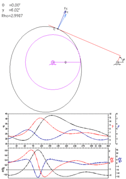 A common type is in the valve actuators in internal combustion engines. Here, the cam profile is commonly symmetric and at rotational speeds generally met with, very high acceleration forces develop. Ideally, a convex curve between the onset and maximum position of lift reduces acceleration, but this requires impractically large shaft diameters relative to lift. Thus, in practice, the points at which lift begins and ends mean that a tangent to the base circle appears on the profile. This is continuous with a tangent to the tip circle. In designing the cam, the lift and the dwell angle θ are given. If the profile is treated as a large base circle and a small tip circle, joined by a common tangent, giving lift L, the relationship can be calculated, given the angle φ between one tangent and the axis of symmetry (φ being π/2 − θ/2), while C is the distance between the centres of the circles (required), and R is the radius of the base (given) and r that of the tip circle (required):