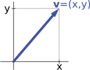 A second key example of a vector space is provided by pairs of real numbers x and y. (The order of the components x and y is significant, so such a pair is also called an ordered pair.) Such a pair is written as (x, y). The sum of two such pairs and multiplication of a pair with a number is defined as follows: [math]\displaystyle{ (x_1 , y_1) + (x_2 , y_2) = (x_1 + x_2, y_1 + y_2) }[/math] and [math]\displaystyle{ a(x, y) = (ax, ay). }[/math]
