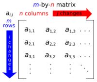 Matrices are a useful notion to encode linear maps.[22] They are written as a rectangular array of scalars as in the image at the right. Any m-by-n matrix [math]\displaystyle{ A }[/math] gives rise to a linear map from Fn to Fm, by the following [math]\displaystyle{ \mathbf x = (x_1, x_2, \ldots, x_n) \mapsto \left(\sum_{j=1}^n a_{1j}x_j, \sum_{j=1}^n a_{2j}x_j, \ldots, \sum_{j=1}^n a_{mj}x_j \right), }[/math] where [math]\displaystyle{ \sum }[/math] denotes summation, or, using the matrix multiplication of the matrix [math]\displaystyle{ A }[/math] with the coordinate vector [math]\displaystyle{ \mathbf{x}: }[/math]