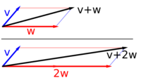 The following shows a few examples: if a = 2, the resulting vector aw has the same direction as w, but is stretched to the double length of w (right image below). Equivalently, 2w is the sum w + w. Moreover, (−1)v = −v has the opposite direction and the same length as v (blue vector pointing down in the right image).