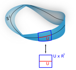 A vector bundle is a family of vector spaces parametrized continuously by a topological space X.[64] More precisely, a vector bundle over X is a topological space E equipped with a continuous map [math]\displaystyle{ \pi : E \to X }[/math] such that for every x in X, the fiber π−1(x) is a vector space. The case dim V = 1 is called a line bundle. For any vector space V, the projection X × V → X makes the product X × V into a "trivial" vector bundle. Vector bundles over X are required to be locally a product of X and some (fixed) vector space V: for every x in X, there is a neighborhood U of x such that the restriction of π to π−1(U) is isomorphic[nb 13] to the trivial bundle U × V → U. Despite their locally trivial character, vector bundles may (depending on the shape of the underlying space X) be "twisted" in the large (that is, the bundle need not be (globally isomorphic to) the trivial bundle X × V). For example, the Möbius strip can be seen as a line bundle over the circle S1 (by identifying open intervals with the real line). It is, however, different from the cylinder S1 × R, because the latter is orientable whereas the former is not.[65]