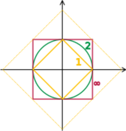 A way to ensure the existence of limits of certain infinite series is to restrict attention to spaces where any Cauchy sequence has a limit; such a vector space is called complete. Roughly, a vector space is complete provided that it contains all necessary limits. For example, the vector space of polynomials on the unit interval [math]\displaystyle{ [0, 1], }[/math] equipped with the topology of uniform convergence is not complete because any continuous function on [math]\displaystyle{ [0, 1] }[/math] can be uniformly approximated by a sequence of polynomials, by the Weierstrass approximation theorem.[43] In contrast, the space of all continuous functions on [math]\displaystyle{ [0, 1] }[/math] with the same topology is complete.[44] A norm gives rise to a topology by defining that a sequence of vectors [math]\displaystyle{ \mathbf{v}_n }[/math] converges to [math]\displaystyle{ \mathbf{v} }[/math] if and only if [math]\displaystyle{ \lim_{n \to \infty} |\mathbf v_n - \mathbf v| = 0. }[/math] Banach and Hilbert spaces are complete topological vector spaces whose topologies are given, respectively, by a norm and an inner product. Their study—a key piece of functional analysis—focuses on infinite-dimensional vector spaces, since all norms on finite-dimensional topological vector spaces give rise to the same notion of convergence.[45] The image at the right shows the equivalence of the [math]\displaystyle{ 1 }[/math]-norm and [math]\displaystyle{ \infty }[/math]-norm on [math]\displaystyle{ \mathbf{R}^2: }[/math] as the unit "balls" enclose each other, a sequence converges to zero in one norm if and only if it so does in the other norm. In the infinite-dimensional case, however, there will generally be inequivalent topologies, which makes the study of topological vector spaces richer than that of vector spaces without additional data.