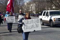 The English Defence League (EDL), an organization in the United Kingdom, has been described as anti-Muslim. It was formed in 2009 to oppose what it considers to be a spread of Islamism, Sharia law and Islamic extremism in the UK.[147] The EDL's former leader, Tommy Robinson, left the group in 2013 saying it had become too extreme and that street protests were ineffective.[148]