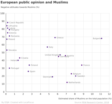 The extent of negative attitudes towards Muslims varies across different parts of Europe. Polls in Germany[150][151] and the Czech Republic[152] (as well as South Korea)[153] have suggested that most respondents do not welcome Muslim refugees in those countries.