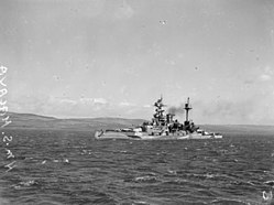 On 19 August 1943 Stratheden sailed unescorted from Bombay to Durban, where she embarked 4,653 troops and on 14 September sailed for Egypt. She sailed as far as Aden with Convoy CM 45, whose largest troop ship was Stirling Castle. CM 45 was heavily escorted by the battleship HMS Ramillies, heavy cruiser HMS Frobisher, light cruiser HMS Durban, three Royal Navy destroyers and three Australian destroyers.[34] From Aden Stratheden continued unescorted through the Suez Canal and reached Port Said on 16 October.[10]