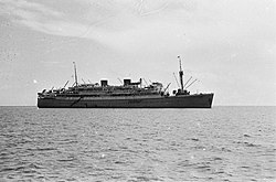 In Bombay they were joined by Strathnaver. On 27 September 1944 Stratheden carrying 2,017 troops, Strathmore carrying 3,382 and Strathnaver carrying 1,467 left Bombay in Convoy BAF 5, which took them as far as Aden.[46] From there they continued unescorted to Port Said. On 10 October Stratheden carrying 2,585 troops, Strathmore carrying 3,629 and Strathnaver carrying 1,902 left Port Said in Convoy MKF 35. In the western Mediterranean more troop ships joined from Naples including Capetown Castle and Monarch of Bermuda, and other troop ships joined from Algiers. By the time MKF 35 passed Gibraltar it included at least 14 troop ships carrying at least 17,425 troops and 5,876 passengers. On 21 October MKF 35 reached Liverpool.[47] There Stratheden parted company with her sisters and spent the rest of 1944 in home waters.