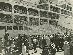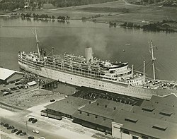 Stratheden's pre-war service alternated seasonally between scheduled liner services and holiday cruises.[4] Her scheduled liner route was between Tilbury in England and Brisbane in Queensland via the Straits of Gibraltar, Suez Canal, Bombay, Colombo, Fremantle, Adelaide, Melbourne and Sydney.[2] She left Tilbury on her maiden voyage to Brisbane on Christmas Eve, 24 December 1937.[4]