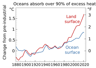 The ocean and atmosphere can work together to spontaneously generate internal climate variability that can persist for years to decades at a time.[17][18] These variations can affect global average surface temperature by redistributing heat between the deep ocean and the atmosphere[19][20] and/or by altering the cloud/water vapor/sea ice distribution which can affect the total energy budget of the Earth.[21][22]