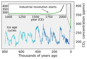 CO 2 concentrations over the last 800,000 years as measured from ice cores (blue/green) and directly (black)