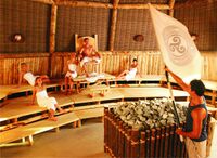 Western saunas originated in Finland where the oldest known saunas were made from pits dug in a slope in the ground and primarily used as dwellings in winter. The sauna featured a fireplace where stones were heated to a high temperature. Water was thrown on the hot stones to produce steam and to give a sensation of increased heat. This would raise the apparent temperature so high that people could take off their clothes. The first Finnish saunas were always of a type now called savusauna; "smoke sauna".[11][12] These differed from present-day saunas in that they were operated by heating a pile of rocks called a kiuas by burning large amounts of wood for about 6 to 8 hours and then letting out the smoke before enjoying the löyly, a Finnish term meaning, collectively, both the steam and the heat of a sauna. A properly heated "savusauna" yields heat for up to 12 hours.[13]