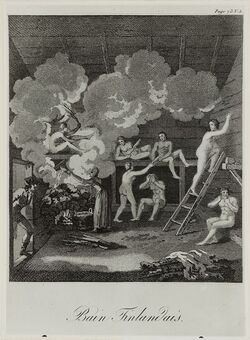 The 13th century bathhouses in the Grand Duchy of Lithuania were mentioned in the Hypatian Codex and Chronicon terrae Prussiae, as they were practised by the Lithuanian dukes.[62] Livonian Chronicle of Henry describes a bathhouse built around 1196 near the pier on the bank of Daugava river.[63] The chronicle also mentions the year 1215 baths of the Latgalian ruler Tālivaldis which were built in Trikāta.[63] These baths are also mentioned in the Livonian Rhymed Chronicle.[63] Sauna had a considerable role in the pagan traditions of the Baltic people. In the 17th century, Matthäus Prätorius described various rituals the Baltic people practiced in sauna.[61] For example, sauna was a primary place for women to give birth and rites would be performed for the Baltic goddess Laima.[61] At that time, sauna traditions were similar in Aukštaitija, Samogitia, Latgale, Semigallia as well as some West Slavic lands.[62] In 1536, Vilnius gained a royal privilege to build public bathhouses and by the end of the 16th century, the city already had 60 of them with a countless number of private ones.[62] In Latvian lands, bathhouses became particularly popular in the 19th century.[60]