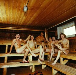 The sauna known in the western world today originates from Northern Europe. In Finland, there are built-in saunas in almost every house, including communal saunas in the older apartment buildings; since the 80s, private saunas have often been built into the bathrooms of typical Finnish flats in apartment buildings, sometimes even in student housing.[20] There are also a number of public saunas in Finland, including Rajaportin Sauna, a sauna located in Tampere, that was first established in 1906 by Hermanni and Maria Lahtinen.[21] Helsinki even has a sauna built into one of the gondolas of a ferris wheel, SkyWheel Helsinki.[22] Unlike many other countries, Finnish people usually prefer to be naked instead of wearing a swimsuit, towel, or other kind of clothing.