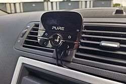Vehicles can be retrofitted or upgraded with additional, non-fixed audio systems. FM transmitters provide a way of listening to audio output from a device using the car's FM radio.[38][39] Cassette tape adapters give the ability of an auxiliary input on a car cassette deck, being able to output audio on the car stereo from a smartphone, portable CD player and any other equipment using the standard headphone jack. There also exist cassette adapters that make use of Bluetooth.[40] Older cars that may lack Bluetooth in its stereo unit can also be fitted with a Bluetooth adapter through e.g. the car's cigarette power outlet.[41]