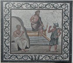 Asclepius (center) arrives in Kos and is greeted by Hippocrates (left) and a citizen (right), mosaic, 2nd–3rd century AD