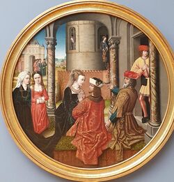 This painted image, which is part of a 1475 painted Flemish manuscript of unknown origin, shows Aseneth repenting.[18] This image is likely inspired by an apocryphal text that describes Aseneth rejecting her pagan religion and repenting so that she may marry Joseph.[19]