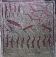 In addition to the Trundholm chariot, there are numerous petroglyphs from the Nordic Bronze Age that depict chariots. One petroglyph, drawn on a stone slab in a double burial from c. 1000 BCE, depicts a biga with two four-spoked wheels.