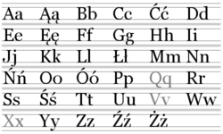 The Polish alphabet contains 32 letters. Q, V and X are not used in the Polish language.
