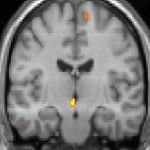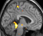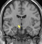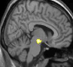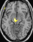 Positron emission tomography (PET) scans indicate the brain areas which are activated during attack only, compared to pain free periods. These pictures show brain areas that are active during pain in yellow/orange color (called "pain matrix"). The area in the center (in all three views) is specifically activated during CH only. The bottom row voxel-based morphometry (VBM) shows structural brain differences between individuals with and without CH; only a portion of the hypothalamus is different.[33]
