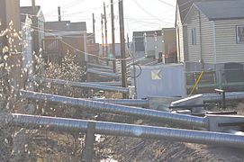 Utilidors are above-ground enclosed utility conduits that are used in larger communities in the northern polar region where permafrost does not allow the normal practice of burying water and sewer pipes underground. They can in particular be found in Inuvik, Northwest Territories and Iqaluit, Nunavut. Not all older homes are connected, and these must rely on trucks to deliver water and remove sewage. Most homes in rural Alaska (off the road system) are not equipped with plumbing and require fresh water and waste to be transported by personal vehicle such as snowmobile or four-wheeler ATV. Villages with utilidors are considered more advanced.