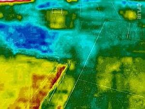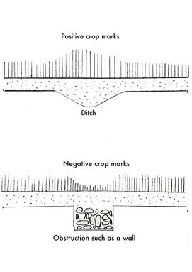 Tiny differences in ground conditions caused by buried features can be emphasized by a number of factors and viewed from the air: