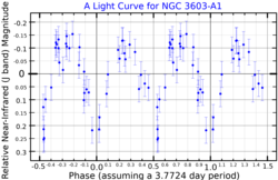 The two component stars of NGC 3603-A1 circle each other every 3.77 days, and show brightness variations of about 0.3 magnitudes due to eclipses. The stars orbit very close to each other, separated by barely their own diameters and at or near to filling their roche lobes.[7]