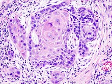 Squamous-cell carcinoma is a cancer of the squamous cell – a kind of epithelial cell found in both the skin and mucous membranes. It accounts for over 90% of all head and neck cancers,[49] including more than 90% of throat cancer.[15] Squamous cell carcinoma is most likely to appear in males over 40 years of age with a history of heavy alcohol use coupled with smoking.