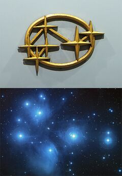 Subaru is the Japanese name for the Pleiades star cluster M45, or the "Seven Sisters" (one of whom tradition says is invisible – hence only six stars in the Subaru logo), which in turn inspires the logo and alludes to the companies that merged to create FHI.[10]