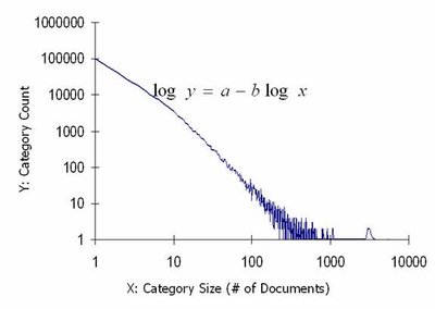 The scale of real-world text classification applications, both in terms of the number of classes as well as the (often highly unbalanced) number of training examples, poses interesting research challenges. For example, the Yahoo! taxonomy (2004 version) for web page classification contains nearly 300,000 categories over a 16-level hierarchy (Liu et al. 2006), with a total of approximately 800,000 documents and a vocabulary of over 4 million unique words. Figure 1 shows the power-law correspondence between the category size (in terms of the number of documents) on the X-axis and the number of same-sized categories on the Y-axis. Less than 1% of the categories had more than 100 documents per category at the time the taxonomy was crawled in 2004. This means that if a statistical classifier requires approximately 100 positive training examples per category for learning sufficiently accurate models, then we can only solve the classification problem for only 1% of the categories even if we use the entire set of 800,000 pages as training examples. Clearly, how to effectively learn from relatively sparse training examples is therefore crucial for the true success of text categorization methods, and this has been a challenging research topic. Recent work in multi-task learning, for example, focuses on how to leverage cross-category dependencies, how to “borrow” training examples among mutually dependent categories and how to discover latent structures in a functional space for joint modeling of dependent categories (J Zhang, 2006; T Zhang, 2005, 2007).