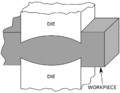 In commercial impression-die forging, the workpiece is usually moved through a series of cavities in a die to get from an ingot to the final form. The first impression is used to distribute the metal into the rough shape in accordance to the needs of later cavities; this impression is called an "edging", "fullering", or "bending" impression. The following cavities are called "blocking" cavities, in which the piece is working into a shape that more closely resembles the final product. These stages usually impart the workpiece with generous bends and large fillets. The final shape is forged in a "final" or "finisher" impression cavity. If there is only a short run of parts to be done, then it may be more economical for the die to lack a final impression cavity and instead machine the final features.[4]