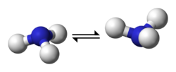 In chemistry, pyramidal inversion (also umbrella inversion) is a fluxional process in compounds with a pyramidal molecule, such as ammonia (NH3) "turns inside out".[1][2] It is a rapid oscillation of the atom and substituents, the molecule or ion passing through a planar transition state.[3] For a compound that would otherwise be chiral due to a stereocenter, pyramidal inversion allows its enantiomers to racemize. The general phenomenon of pyramidal inversion applies to many types of molecules, including carbanions, amines, phosphines, arsines, stibines, and sulfoxides.[4][2]